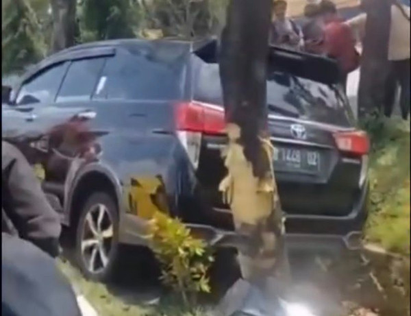 Dalam video singkat yang beredar luas di media sosial terlihat bagian depan sebelah kanan mobil hancur cukup parah. Ban depan kanan bahkan tampak copot akibat benturan keras.