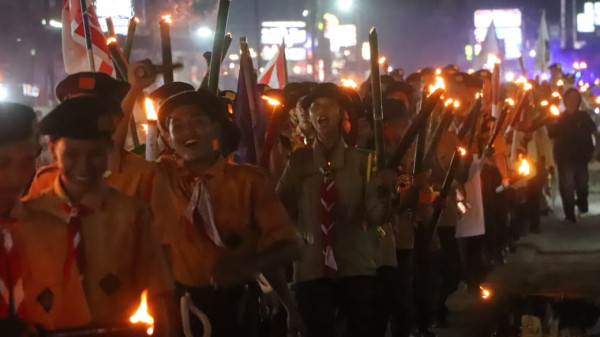 Deretan obor yang menyala menerangi jalur pawai, menciptakan suasana khidmat sekaligus penuh semangat. Para peserta berjalan tertib menyusuri rute yang telah ditentukan, sebagai simbol pembaruan tekad untuk terus berkontribusi bagi masyarakat, bangsa, dan negara.