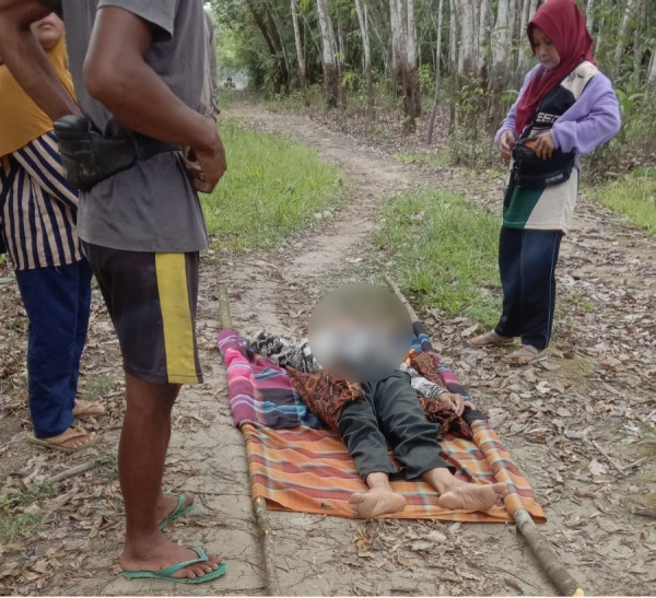 Abson dibantu tiga warga memikul tandu melintasi jalan tanah setapak. Beberapa kali langkah mereka terpaksa terhenti untuk mengatur napas.