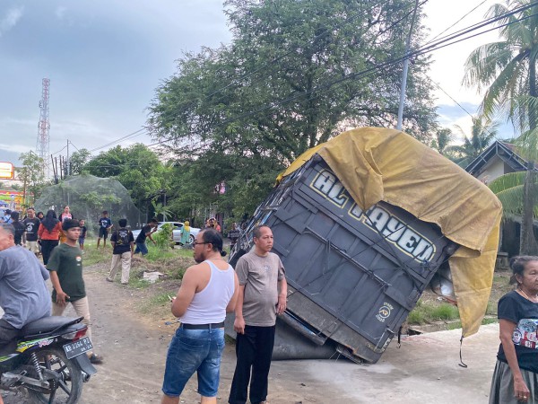 Hindari Pengendara Sepeda Motor, Truk Tabrak Pohon di Pemangkat hingga Terbalik Masuk Parit